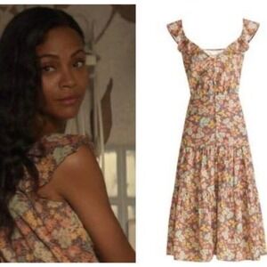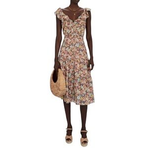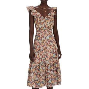 Veronica Beard packs their Malgosia cotton dress full of feminine details: ruffled straps, calf-grazing tiers and flirty florals, for a cotton clad staple. Button front closures. Side zip and snap closures.