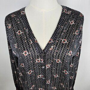 tags: Old money, rich girl, clean lines, classic, capsule wardrobe, closet staple, clean girl, timeless, professional, office, quiet luxury, rich mom, rich wife, designer, Veronica Beard blouse, silk blouse, v-neck silk top, casual silk top, designer silk blouse, floral black shirt, dark cottagecore, luxury silk shirt, whimsigoth