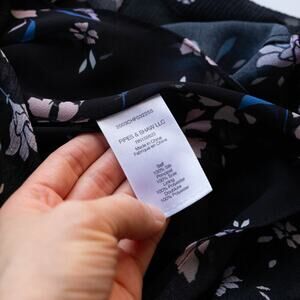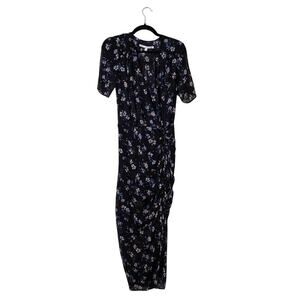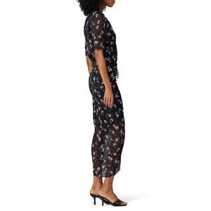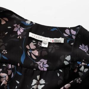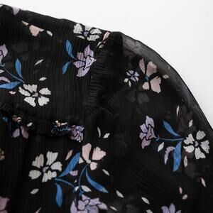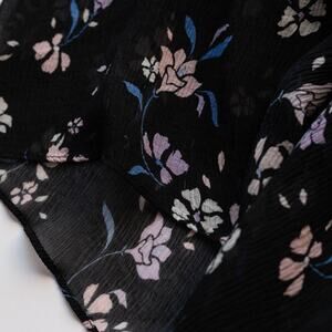 Black floral printed chiffon (92% Silk, 8% Spandex). Sheath. Short sleeves. V-neckline. Hidden back zipper closure. Partially lined.