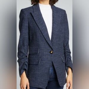 Textured, almost a herringbone or tweed design Fully lined with preppy classic blue and white stripes lining In classic Veronica Beard fashion, super cute details and design set this blazer apart from all the other schoolboy blazers out there: • Notched collar • Single front button • Chest pocket • Slightly cropped sleeves • Cute ruched sleeve detail • 5 buttons on sleeve • Single vent at the back