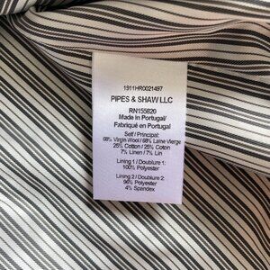 50% Wool, 25% Cotton, 7% Linen. Peak lapels. Shoulder pads. Single chest welt pocket. Side flap pockets. Single front button closure. Long sleeves with button cuffs. Back slit. Dickey compatible. Lined. Professional dry-clean.