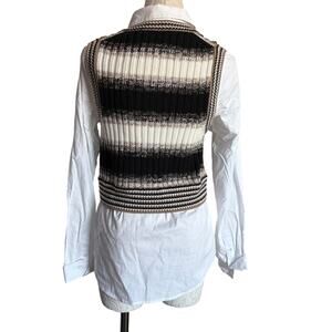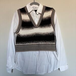 Gorgeous preppy-chic layered-look piece featuring a striped merino wool cropped sweater vest attached to a crisp white button-down shirt. The combo design gives effortless styling with minimal effort—perfect for workwear, brunch, or fall layering.