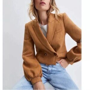 Never worn blazer + matching shorts set! Veronica Beard Milani Jacket and Shorts in Camel Linen. Cropped blazer jacket features puff sleeves, a button closure, and is crafted from high-quality linen fabric. The warm camel color looks as phenomenal paired with other pants/shorts or tops. Classic design and sophisticated details—super versatile and extremely stylish! Jacket: Pit to pit buttoned approximately 16-18", Length 20" Shorts:
