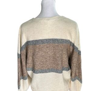Veronica Beard "Miley" colorblock sweater with metallic details. V neckline. Long sleeves. Relaxed silhouette. Pullover style. Polyacrylic/nylon/merino wool/alpaca/spandex. Dry clean. Imported