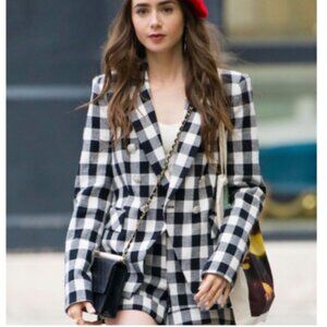 Veronica Beard black and white gingham linen blazer.