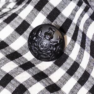 This timeless plaid blazer showcases gathered sleeves, a simulated double-breasted button style, rouched scrunch sleeves, pockets, chic gingham print, and effortlessly complements denim or the coordinating plaid pants (not included). Fully lined with a fun blue and white striped print. It can be paired with any of Veronica Beard's Dickeys.