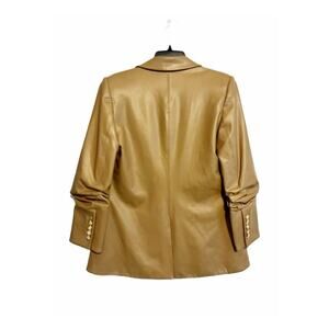 Description: Faux vegan leather blazer jacket, button embellishment, ruched sleeves, flap pockets, hooked fastening front closure, lined