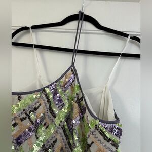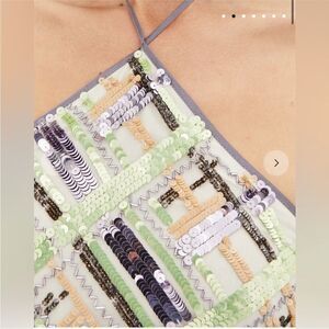 Due to the delicacy to this dress, there are a few thread pulls which have caused some sequined to fall off. These flaws cannot be seen when wearing. Please see last picture to see an example.