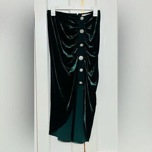 Side ruching shapes a plush party skirt, cut from silk-kissed emerald velvet and fastened with pearly buttons.