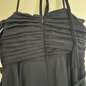 Elegant navy midi dress. Features ruched bodice. Halter neckline. Perfect for evening wear.