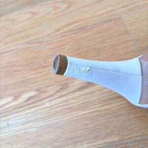 This scrunched leather sandal features a toe & covered stiletto heel.