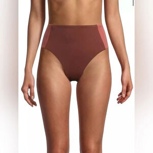 Tonal colorblock panels add dimension to this high-waist bikini bottom.