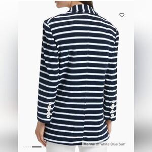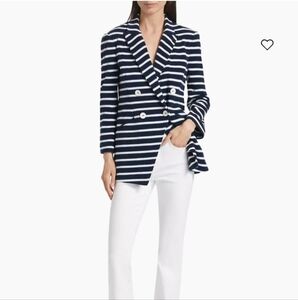 The Ortiz jacket from Veronica Beard features a double-breasted design with sailor-inspired stripes. Welt pockets and peak lapels complete the look.