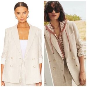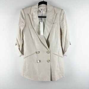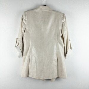Interior zipper for Dickey attachment, tailored silhouette, structured linen blend, double-breasted button closure, Peak lapels, Elbow-length sleeves, roll-tab cuffs, Chest welt pockets, Hip welt pockets, Dry clean. Cream with a metallic sheen. Casual, business, work, dressy, neutral, spring.