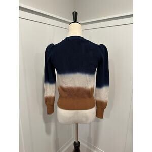 Retail price is $348. Color is Navy Multi. Colors are Navy/Ivory/Khaki. 100% cotton. Shaker knit. Slight puff sleeve.