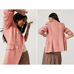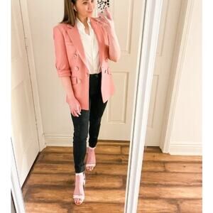 Chic pink blazer. Double-breasted design. Perfect for layering.