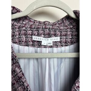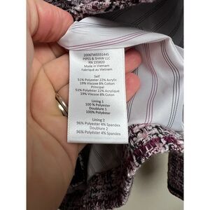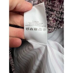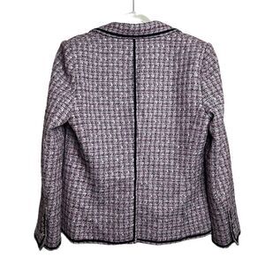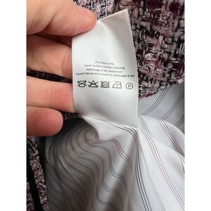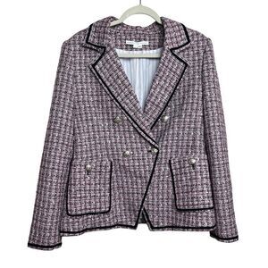 Elegant checkered blazer with double-breasted style. Features pink and black tones. Ideal for a sophisticated outfit.