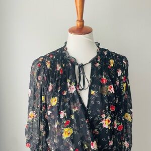 This elegant sheath dress by Veronica Beard features a striking asymmetrical ruched design with a tie front collar. The long bishop sleeves add a touch of sophistication, making it perfect for a wedding guest or cocktail occasion. The dress showcases a beautiful blend of pink and black hues, creating a captivating look.