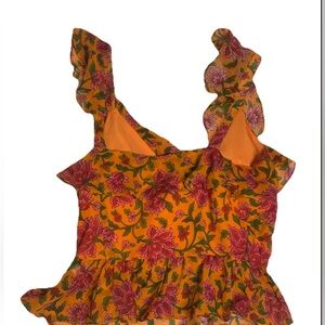 This top from Veronica Beard is made purely from silk and features an all-over floral print and ruffled V neckline and peplum .