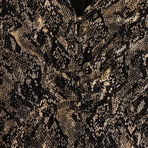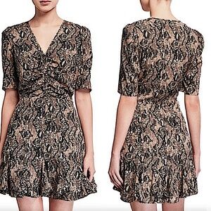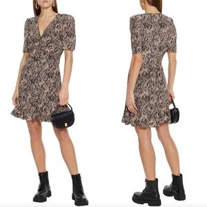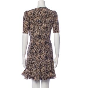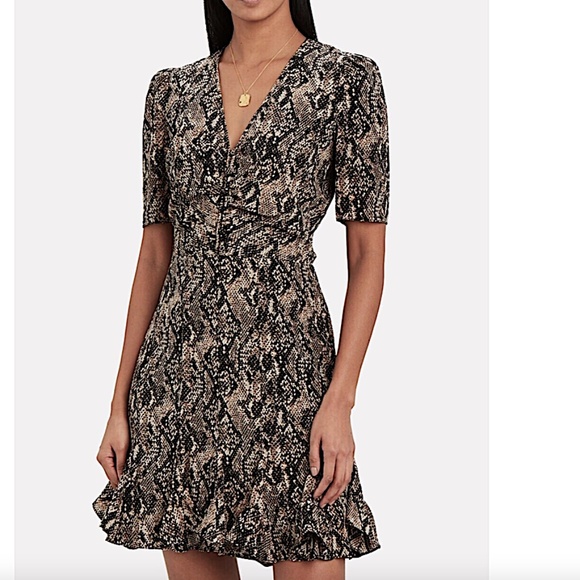 Veronica Beard 'Ried' Python Print Silk Mini-Dress, Black Multi. Original Price:$595 Veronica Beard 'Ried' silk mini-dress featuring an allover python print on luxe silk. Veronica Beard Silk A-Line Dress Neutrals Animal Print Ruffle Embellishment Short Sleeve with V-Neck Concealed Zip Closure at Side V-neckline. Covered button front. Short puff-shoulder sleeves. Hidden side zipper and snap closure. Fitted waistline. Allover python print. Flounce hemline. Approx. L - 36". Lined. 100% silk. Dry clean. Color: Black Multi. New, with tags attached. Original retail $595.00.