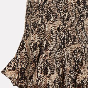 Allover python print. Flounce hemline. Approx. L - 35". Lined.