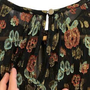 Sheer black with multicolor floral print in rust, sage, gold and teal.
