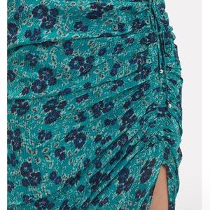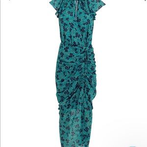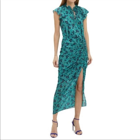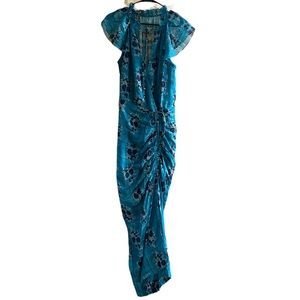 This silk crepe floral dress features feminine ruching -Ruffled high neck with a keyhole closure. Flutter cap sleeves. Concealed zip closure. Partially lined. In turquoise/floral.