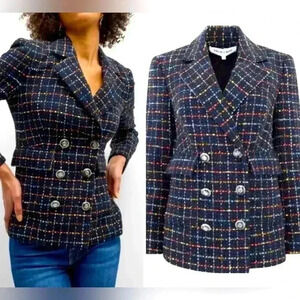Veronica Beard Rumer Dickey Blazer Jacket 10 Tweed Double Breasted Navy Check