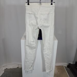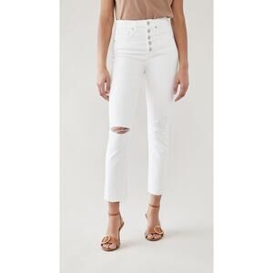 Ryleigh slim fit high-rise jeans made with mid-weight stretch denim, high waist with exposed button fly, ankle length, 5-pocket styling, note: Some very light wear by back waistline.