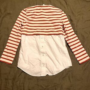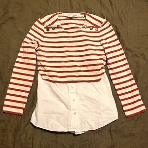 A striped crop panel over a classic button-down, creating the illusion of a layered look! Buttons at the shoulders.