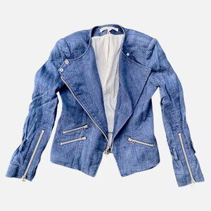 Veronica Beard Sienna Collarless Denim Moto Jacket 0 Linen Blend Jean Zip Up USA