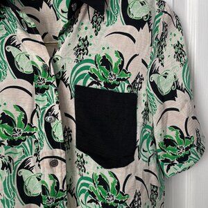Veronica Beard Silk Cropped Button Up Shirt. The silk is so smooth. Textured and floral print. Contract black collar and front pocket. Short sleeves. It has all the feels of a Palm Springs in a Mid-Century Modern vacation home. Also seen on TV worn by celebrities. In really good condition with one repair on the inside right sleeve (see photo). Very lightweight and flowy.