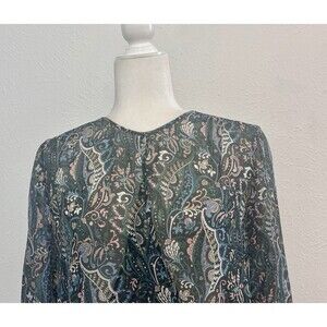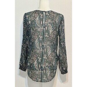 The Veronica Beard Size 2 Gayle Floral Print Surplice Silk Blouse is a boho-feminine top perfect for parties or cocktails. Made from chiffon silk, this lightweight blouse features a round neckline, long sleeves, and a pullover closure. The green floral pattern adds a touch of designer luxury to this bohemian-inspired piece, which is ideal for the summer, fall, and spring seasons. Perfect for women who want to make a stylish statement with a unique and fashionable top that is both comfortable and chic.