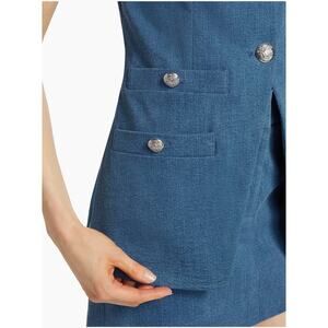 Crafted of luxe denim, Veronica Beard's Tamara vest top features an exaggerated vented hem and structured shoulders for a tailored fit. Silvertone crested buttons complete the sleeveless piece.