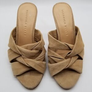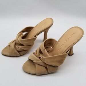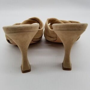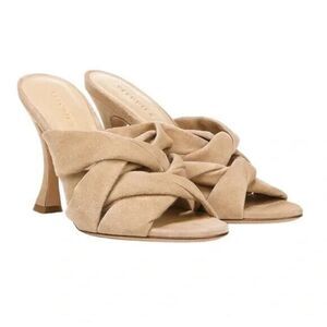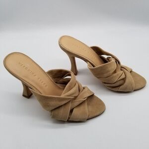 Elegant tan heeled sandals with a twisted strap design. Perfect for any occasion.