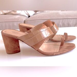 Elevate your look with these stylish tan suede sandals by Veronica Beard. Ideal for versatile wear. 3 inch heel.