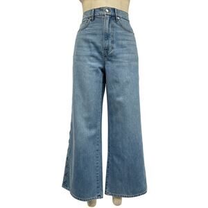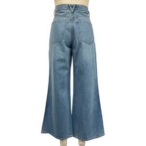 Veronica Beard 'Taylor' Blue Cotton High Rise Cropped Wide Leg Jeans Size 28: zip fly with button closure, five-pocket silhouette, contrast stitching, silver-tone logo hardware, belt loops, light whiskering, wide-leg silhouette, cropped hem.