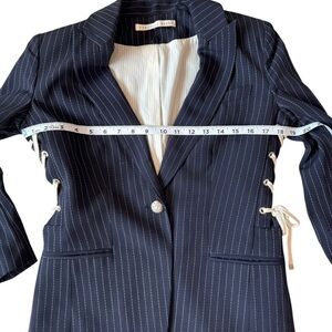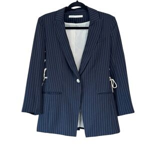 Veronica Beard Taylor Lace Up Blazer Navy White Stripe. Size 8. Excellent pre-owned condition. No tears, stains, or piling. Features: Button front closure, breast and front welt pockets, lace up detail along sides, black slit accent, lightly padded shoulders, zipper for Dickey insert Approximate flat lay measurements: Pit to Pit: 18” Shoulder Length: 16” Waist: 16” Length: 26.5” Sleeve Length: 20” Sleeve Opening: 5” Tags: outerwear, blazer, jacket, designer, business, professional, job career, office, internship, work, workwear, formal , dark blue, navy, classic, revolve, Veronica Beard, transitional