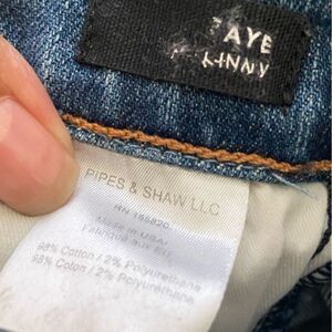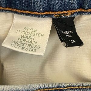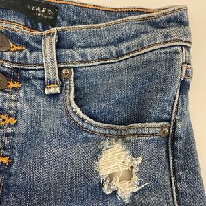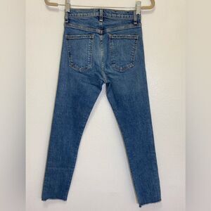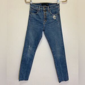 Exposed Button Fly Closure - Skinny Leg - Lightly Distressed on the front only - Raw Hem - High Rise