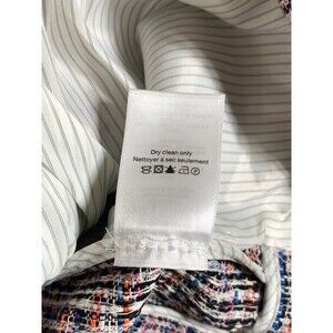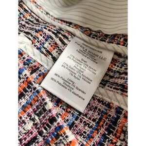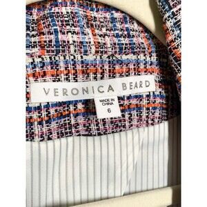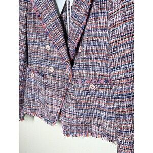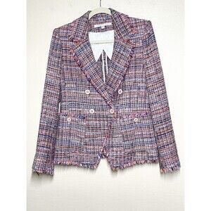 Veronica Beard "Theron" blazer jacket in blue, orange, pink, white, and black tweed. Double-breasted, pockets, pocket closure, partially lined, cotton blend. Retail $650