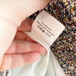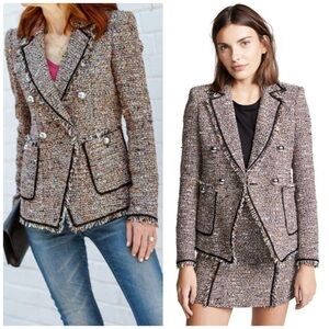 Double breasted button details, notch lapel collar, textured tweed with piped details, raw frayed hem, long sleeve with button cuffs. Cotton, poly, acrylic, nylon blend. Brown, black, red. Casual, work, dressy, professional, career, suit, designer, tailored.