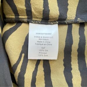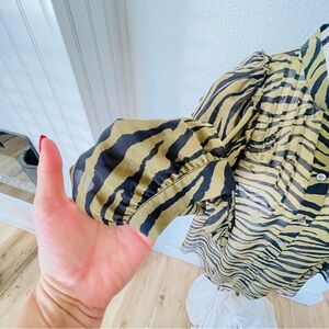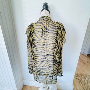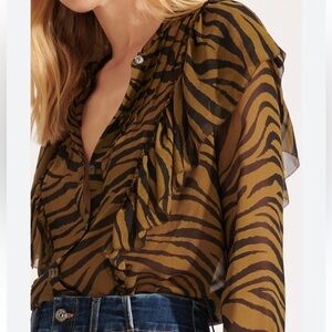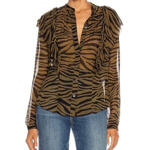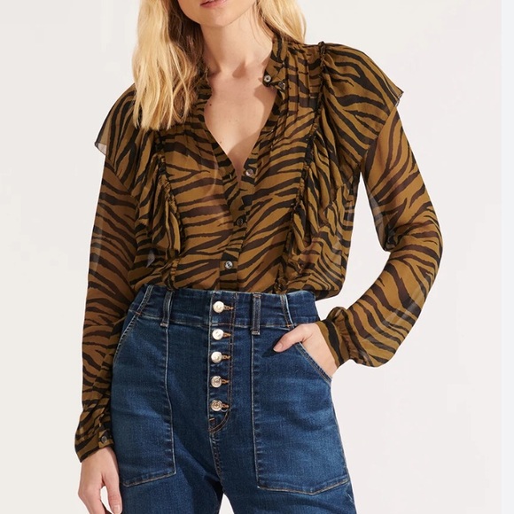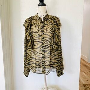 Sheer lightweight blouse with bold tiger stripe print. Feminine ruffle trim along the collar. Button-front closure for a polished look. Long sleeves with subtle gathering at the cuff. Elegant, wearable statement piece.