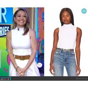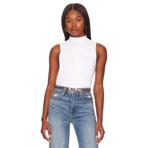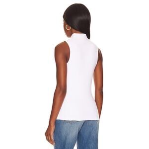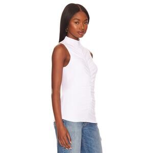 Veronica Beard Vargas Tank in White. Size M / Medium. Features mock neck, sleeveless, ruched front, and knit jersey fabric. Style J2209JY025S0375. 96% Modal, 4% Spandex. Excellent condition, no flaws. Worn by Eva Pilgrim.