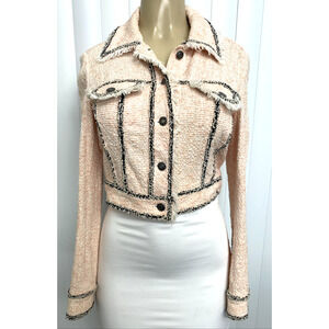 Veronica Beard Vita Tweed Jacket Pale Pink Crop Black Trim Button Fringe 2 XS