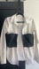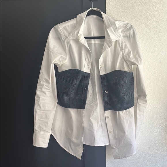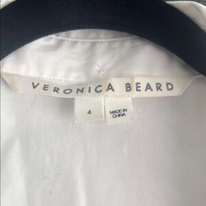 This Veronica Beard button down shirt features a crisp white fabric that exudes elegance and sophistication. The standout design element is the modern color-blocked effect created by two large rectangular patches on the chest, adding a contemporary twist to a classic silhouette. Perfect for making a statement at any occasion, this shirt combines timeless style with a bold, avant-garde aesthetic.
