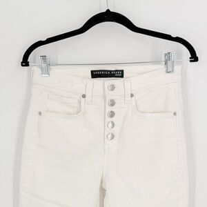 These white skinny jeans from Veronica Beard offer a sleek and modern silhouette, perfect for any occasion. Crafted with a solid color design, they provide a clean and polished look. The jeans are made to fit snugly, accentuating your style with a contemporary edge.