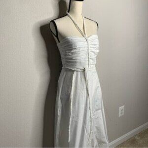 This dress is a chic and summery halter-neck piece, crafted from a lightweight and airy white fabric, offering a fresh and elegant look. The dress features a fitted bodice with a ruched design, which adds texture and visual interest. The ruching is complemented by a delicate tie at the center, emphasizing the waist and providing an adjustable fit. The halter neckline ties elegantly at the back of the neck, creating a flattering open-back style that adds a touch of allure. The dress has a flowy A-line skirt that falls to a midi length. This silhouette is both comfortable and graceful, making it ideal for a variety of occasions, from casual outings to more formal events.