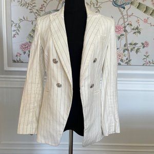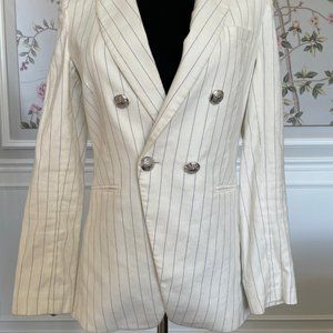 White/Ivory double breasted blazer with brushed silver buttons. Yellow discoloration on neck/upper lapel and sleeve edge-.