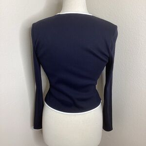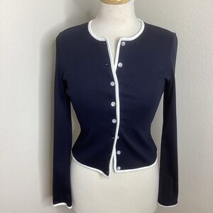 Approx 18” across chest, 17” across bottom, 18” long, 24” sleeves. Button front, mini ribbed navy trimmed in white. Great condition.