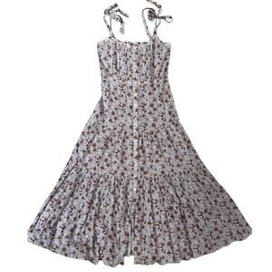 Multicolor floral dress with a pleated bodice and tiered skirt.